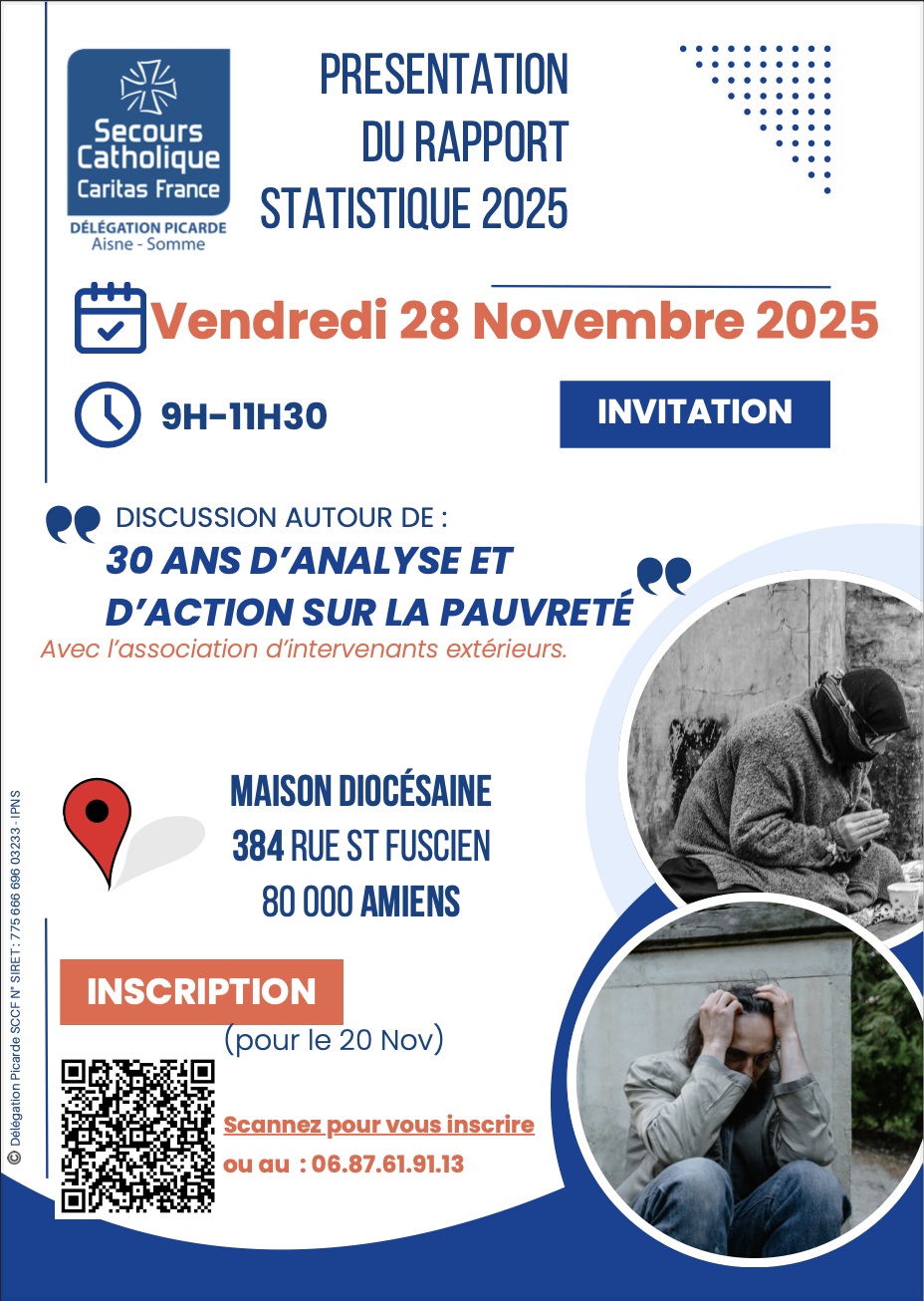 La Délégation Picarde du Secours Catholique de l'Aisne et de la Somme vous invite à un échange sur la présentation du rapport statistique annuel sur l’Etat de la pauvreté en France qui s’intéressera cette année à mettre en lumière les principales évolutions de la pauvreté depuis 30 ans.